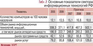 Миссия ИТ – почти национальная идея. В области освоения этой «золотоносной жилы» заметные серьезные подвижки (табл. 2). Налоговое бремя несколько снижено для экспортеров; ИТ-парки строятся и множатся по инициативе хозяев территорий, создается финансовый пул поддержки. Но без курьезов не обошлось. Поощряя экспорт интеллектуального продукта, забыли производителя, который трудится на благо отечественной экономики. Парадоксально! Ведь сегодня главный потребитель – само государство. Доля его заказов достигает 20% общего объема российского ИТ-рынка, и внутренний спрос имеет выраженную тенденцию к ускорению.