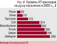 Ключевым показателем развития национального информационного рынка, его влияния на экономику государства является доля ИТ в ВВП: в передовых странах она превышает 3%, наш уровень – 1,4% – характерен для стран с переходной экономикой. Потребление ИТ-продуктов и услуг на душу населения в нашей стране в десятки раз ниже, чем в промышленно развитых странах (рис. 6). Таким образом, Россия имеет существенный «запас» отложенного спроса на информационные технологии, которые будут обеспечивать сохранение высоких темпов потребления ИТ-продуктов и услуг. Динамичный рост информтехнологий в последние годы связан не только с высокими темпами роста российской экономики, высокими ценами на сырье на мировых рынках, повышением уровня доходов граждан, но и целым рядом дополнительных факторов, наиболее важные из которых: