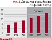 Несмотря на то что в ближайшие годы прогнозируется снижение динамики ИТ-рынка до 15–17%, на долгосрочную перспективу она все равно будет гораздо выше темпов роста традиционных секторов экономики. Такая оценка обусловлена тем фактом, что, наряду с успехами последних лет, по уровню национального ИТ-потребления Россия существенно отстает не только от развитого Запада и «азиатских тигров», но и от большинства стран с переходной экономикой (Восточная Европа и Индия). Нарастающая глобализация в экономической, социальной и гуманитарной сферах будет способствовать все более активному использованию ИТ.