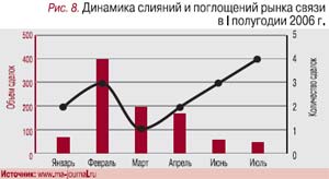 Телекоммуникации показали в уходящем году высокую активность в целом – ни одно событие на этом рынке в отдельности не повлияло кардинально на общий ход развития. Это хороший знак – значит, отрасль развивается без стрессовых ситуаций. Самым значимым стратегическим процессом на рынке телекоммуникаций в 2006 г. был, пожалуй, процесс консолидации отрасли. Только с января по июль нынешнего года произошло 18 слияний и поглощений (сделки на $5 млн и более) с суммарным объемом транзакций почти $1 млрд. Несмотря на высокую концентрацию капитала в отрасли, остается еще достаточно возможностей для роста активности и в следующем году (рис. 8).