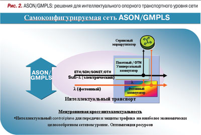 Функциональность GMPLS с распределенным уровнем системы управления (Control Plane), отделенным от уровня передачи данных (Data Plaine), стала следующим этапом эволюции технологий MPLS для использования их в транспортных сетях. МСЭ-Т (ITU-T) более глубоко рассмотрел сетевые аспекты применения этой функциональности в ряде рекомендаций для Automatically Switched Optical Network (ASON). OIF завершил стандартизацию сетевых интерфейсов. Пользовательские интерфейсы UNI служат для доступа к сети ASON для запроса на предоставление услуг, контроля соединений, обеспечения QoS в соответствии со SLA, сбора сообщений об отказах и т.п. Сетевые интерфейсы NNI предназначены для связи между сетевыми элементами, сетевыми доменами и разными сетями. На этом уровне в рамках Control Plane ведутся обработка запросов на соединения, их организация и контроль, обмен в определенных объемах информацией о доступных ресурсах в сетевых элементах и соединениях, маршрутизация сервисов между сетевыми доменами и т.п.Одно из основных достоинств интеллектуальной транспортной сети с функциональностью ASON – способность по требованию пользователей или запросу от системы централизованного управления сетью автоматически устанавливать: