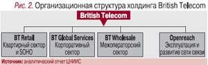 В холдингах второго типа компании специализируются на организации продаж услуг разным целевым группам потребителей. Функции эксплуатации и развития сетей связи могут быть переданы отдельной компании. Такова, например, структура холдинга BT (рис. 2); оператор перешел к ней, готовясь к строительству сети NGN 21CN (подробно см. «ИКС» № 5'2006 с. 98–99).