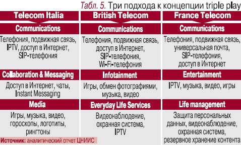 Несколько позже свое видение услуг triple play представили два других ведущих европейских оператора – BT и France Telecom. Их подходы несколько отличаются от мнения Telecom Italia (табл. 5).