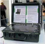 В экспозиции ГК «Информтехника» выделялись две новые разработки, каждая из которых является портативным дополнением к системам, выпускаемым уже несколько лет. АТС «МиниКом DX-500-compact» предназначена для установки на объектах с относительно небольшим числом абонентов. Но с особой гордостью сотрудники «Информтехники» демонстрировали посетителям новый портативный комплекс подвижной связи «МиниКом-TETRA-Compact», мобильный вариант системы «МиниКом-TETRA». Комплекс предназначен для быстрой организации подвижной радиосвязи на ограниченной территории и может обслуживать до 150 абонентов. Базовая станция упакована в чемодан размером 34 x 46 x 17 см и весит всего 15 кг. Правда, в комплект входит еще антенная опора весом до 70 кг, ретранслятор радиосигнала, АРМ оператора (ноутбук в полевом исполнении) и сервер управления (компьютер в ударопрочном корпусе), но для перевозки этого оборудования достаточно легкового автомобиля. «МиниКом-TETRA-Compact» может заинтересовать МЧС, Минобороны, учреждения здравоохранения, транспортные компании и другие организации.