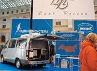Как и на большинстве сегодняшних телекоммуникационных выставок, не обошлось без автомобиля. Красивый и безумно одинокий, микроавтобус «Соболь» под названием «Мобильный узел связи Банка России» украшал совместную экспозицию компаний «Радиокомсистема» и «Морсвязьспутник» . Из-под поднятой вверх задней двери проглядывала высокотехнологичная начинка. Сухопутная подвижная радиосвязь, спутниковая и транкинговая компоненты, система диспетчеризации обеспечивают мобильных абонентов Банка России услугами связи на территории всей страны. В отсутствие сети система электропитания гарантирует автономную работу автомобиля в течение суток. В систему также входит малошумный генератор, кондиционер и обогреватель. Особенность автомобиля – мачта с электроприводом, позволяющая за 5 минут развернуть транкинговую радиосвязь МРТ-1327. В чрезвычайной ситуации банковские служащие могут передавать данные со скоростью 500 кбит/с через систему Inmarsat BGAN, с помощью которой можно такжевойти в ТфОП.