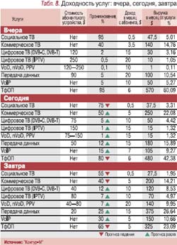 – …передачей данных и коммерческим ТВ. Сегодня (см. табл. 8) коммерческое аналоговое ТВ на подъеме, но совсем скоро сместится со второй позиции по доходности на третью, уступит свои позиции передаче данных. Доходность классической телефонии тоже будет падать. Эта динамика и формирует предпочтения операторов, когда они выбирают технологии. В ближайшие 5–10 лет услуга передачи данных и доступа в Интернет не просто займет лидирующее положение, но и за счет выручки от услуг, базирующихся на передаче данных (VoIP, IPTV, VoD, PPV и т.д.), резко уйдет вперед от традиционной телефонии и аналогового ТВ. А цифровое ТВ в различных форматах будет обеспечивать такую же выручку, как аналоговое. Поэтому сегодня в стране наблюдается бум строительства сетей передачи данных, сетей с глубоким проникновением оптики и сетей с возможностью интеграции различных технологий.