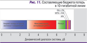 Дополнительное ослабление сигнала из-за его уширения учитывается дисперсионным штрафом по мощности, который в многомодовых оптических трактах вносит самый большой вклад в общий бюджет потерь системы.