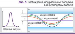 Оптическое волокно является дисперсионной средой, поэтому различные спектральные составляющие излучения распространяются с разными фазовыми скоростями. В многомодовых волокнах из-за большого диаметра сердцевины при вводе излучения от источника возбуждается достаточно большое количество мод (рис. 5). Возникающий волноводный эффект, обусловленный наличием границы раздела двух оптических сред (сердцевина/оболочка) и полным внутренним отражением, определяет возможность распространения нескольких мод излучения по различным лучевым траекториям.