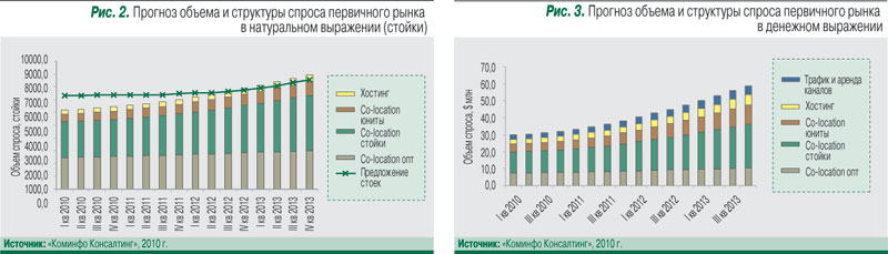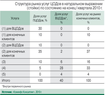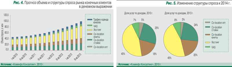 Сегодня на рынке ощущается недостаток информации по прогнозам объема и структуры рынка услуг ЦОДов на среднесрочный период. Единственным адекватным исследованием пока является отчет компании «Современные Телекоммуникации» (2009 г.), ориентированный на анализ предложения на рынке услуг коммерческих ЦОДов в 2008–2010 гг. Восполняя пробел, компания «Коминфо Консалтинг» провела экспертный анализ тенденций спроса на услуги ЦОДов, включая прогноз объема и структуры рынка в денежном и натуральном выражении до 2014 г.