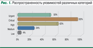 Уязвимости веб-приложений – наиболее распространенный сегодня способ проникновения в информационные системы компаний и реализации атак на клиентов этих компаний. По результатам исследования1, проведенного экспертами компании Positive Technologies, в 2008 г. практически каждый корпоративный веб-портал содержал уязвимости уровней Urgent или Critical (рис. 1), позволяющие нарушителю получить контроль над порталом и/или использовать его для атак на внутренние информационные ресурсы компании либо рабочие места посетителей портала.