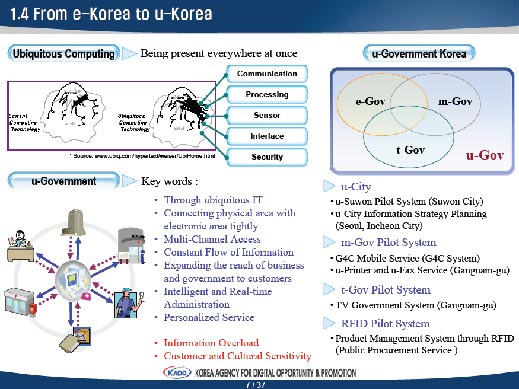 По сути, вездесущность вычислений и связи стали маяками стратегии информатизации Ю. Кореи в настоящем и будущем и знаменует следующую после электронизации (окончилась в Ю. Корее в 2007 г.) стадию информатизации общества. Первое официальное упоминание вездесущности применительно к Ю. Корее относится к 2003 году (См. E-Korea Vision 2006. The Third Master Plan for Informatization Promotion (2002-2006). Ministry of Information and Communication, Republic of Korea, April 2002). Первый национальный план на эту тему заканчивается в 2010 г.