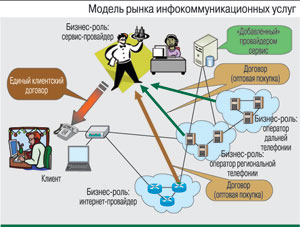 Результатом действия сегодняшних тенденций должно стать изменение модели рынка. Бизнес, непосредственно базирующийся на сетевой инфраструктуре, станет оптовым бизнесом по транспорту информации, организации стандартных сеансов связи, фактически «трубой битов». А взаимодействие с пользователями будет осуществляться в рамках бизнес-роли сервис-провайдера (см. рисунок).