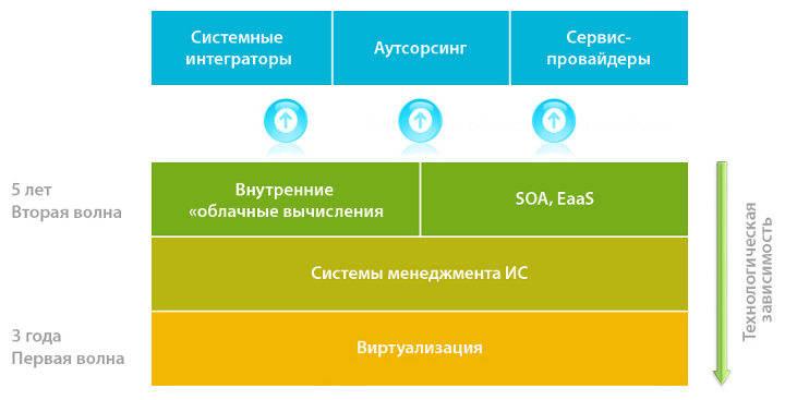 Развитие рынка будет происходить поэтапно в технологическом плане. После стабилизации спроса на решения по виртуализации, начнется фаза активного продвижения и развития систем менеджмента ИС. Все эти этапы можно отнести к «первой волне» развития, происходить это будет в ближайшие 3 года. По заверению этого периода активно в ход пойдут уже сами «облачные» решения, причем возможностей для развития рынка очень много: системные интеграторы будут специализироваться на построении «частных облаков» и решений по интеграции «облаков» между собой. Аутсорсинговые компании будут специализироваться на сопровождении «облачных» ИТ-комплексов, но при этом могут предоставлять и услуги сервис-провайдеров. И сами