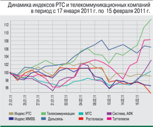 Потери понесли и акции сотового оператора МТС, упав на 4,43% (до уровня 245,95 руб. за акцию). Внимание инвесторов было приковано к новостям, касающимся реорганизации МТС в форме присоединения к ней ОАО «Комстар – Объединенные ТелеСистемы». Совет директоров МТС одобрил отчет об итогах предъявления акционерами требований о выкупе принадлежащих им акций в рамках процедуры присоединения дочерних компаний. К выкупу предъявлено 8 тыс. обычных акций, что составляет 0,0004% уставного капитала оператора. Выкуп акций планируется завершить не позднее 9 марта 2011 г.