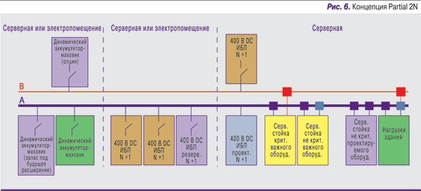 Определение наиболее надежного уровня – Tier 4 – требует пересмотра, так как изменились критические требования к работе систем, особенно в средах облачной обработки данных. А именно, в современных ЦОДах допускается некоторая нестабильность работы на уровне серверных стоек, поскольку для обработки входящей нагрузки весь объем компьютерного оборудования не критичен. Поэтому в ЦОДах уровня Tier 4 можно применять концепцию частичной надежности (рис. 6). Частичное резервирование позволяет уменьшить количество оборудования, подключенного к сети питания, что повышает общую эффективность системы. Конфигурации систем 400 В DC для ЦОДов уровня Tier 4 доступны уже сегодня, несмотря на ограничения, связанные со временем ликвидации неисправностей защитных устройств. Две линии питания обеспечивают высокий коэффициент доступности при любых неисправностях.