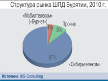 Кстати, Бурятии принадлежит особое место в истории развития российского рынка ШПД: именно здесь в 1998 г. «Мобилтелеком» (бренд «Бурнет») запустил в эксплуатацию первую в стране сеть xDSL. Однако сегодня проникновение услуги в частном сегменте – одно из самых низких в России: всего 14% бурятских домохозяйств подключены к сетям ШПД. Более 60% жителей республики проживают в малых городах и селах с плохо развитой инфраструктурой фиксированной связи – это ключевой фактор, сдерживающий развитие рынка. Однако и в столице Бурятии дела обстоят значительно хуже, чем в соседних крупных городах: в конце 2010 г. всего 26% домохозяйств Улан-Удэ были абонентами ШПД, при том что в соседнем Иркутске показатель проникновения находится на уровне 37%, а в Чите — 40%.