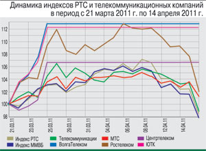 Индекс ММВБ в период с 15 марта по 15 апреля вырос на 3,10% до отметки 1780,36 пункта. Индекс РТС прибавил 4,39%, достигнув 2030,32 пункта. Индекс «ММВБ телекоммуникации» потерял 2,30% (до 2555,47 пункта), в то время как индекс «РТС Телекоммуникации» вырос на 4,16% (до 313,54 пункта).