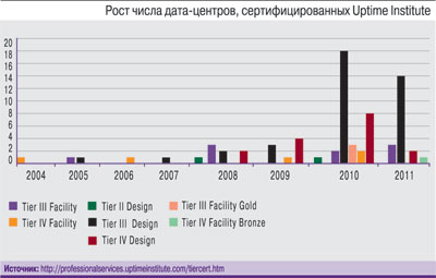 Строго говоря, классификация Uptime Institute – не единственная, на которую ориентируются специалисты в области строительства и эксплуатации ЦОДов. Но именно она получила признание в США и России как наиболее продуманная, сбалансированная, жизнеспособная. Неудивительно, что с 2008 г. все больше компаний изъявляет желание подтвердить соответствие своих дата-центров одному из высших уровней надежности именно по этой шкале оценки качества (см. рисунок). А впервые процедура такой сертификации была проведена в 2004 г.; по ее итогам статус Facility Tier IV был присвоен дата-центру Nationwide Insurance Data Center North.