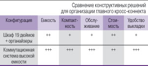 Обобщенное сравнение рассмотренных конструктивных решений для организации оптического главного кросс-коннекта ЦОДа показывает, что коммутационные системы высокой емкости по многим существенным параметрам опережают традиционные решения на основе стоек 19 дюймов (см. таблицу).