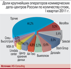 По оценке iKS-Consulting, на долю 10 крупнейших российских операторов ЦОДов приходится около 56% стоек, предназначенных для коммерческой эксплуатации, и 63% доходов.