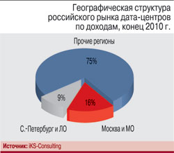 Несмотря на наметившуюся тенденцию выноса дата-центров за пределы крупных городов, заметных изменений в географической структуре этого рынка пока не происходит: 13 из 20 введенных в действие в 2010 г. крупных и средних коммерческих ЦОДов (т.е. 65%) находятся в Москве. В 2011 г. московскими будут 59% вновь запущенных ЦОДов.