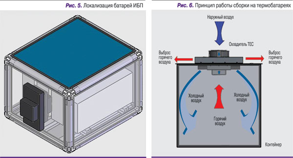 Напомним, что самым чувствительным к перепаду температур блоком БС является батарея ИБП, тогда как само телекоммуникационное оборудование способно работать при температурах от +5 до +40°С. Соответственно, ограничив размерами самих батарей ИБП зону, в которой обеспечивается требуемая для них температура, можно практически на всей территории России отказаться от парокомпрессионных систем и осуществлять охлаждение только за счет наружного воздуха. Для поддержания температуры в таком небольшом объеме производители выпускают изолированные корпуса со сборками на основе термобатарей, использующих эффект Пельтье (рис. 5, 6). Это позволяет при необходимости не только охлаждать, но и нагревать воздух внутри изолированного корпуса с батареями.