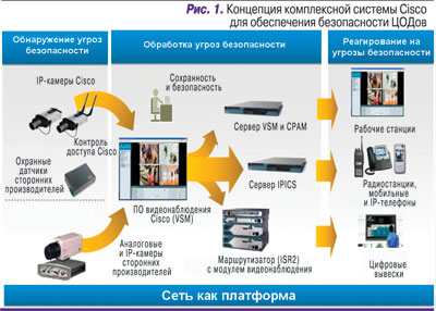 При объединении в единый комплекс систем видеонаблюдения и контроля доступа на базе устройств и ПО компании Cisco создается масштабируемая, настраиваемая и простая в управлении система, обеспечивающая контроль состояния всех компонентов дата-центра в реальном времени (в состав системы войдут камеры наблюдения разных типов, видеосерверы, коммутаторы, маршрутизаторы, серверное и периферийное оборудование контроля доступа, в частности биометрические и RFID-считыватели, замки и т.д., а также соответствующие программные модули Cisco).
