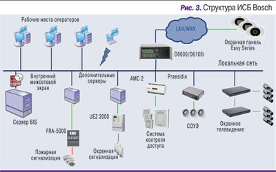 Еще одним примером интеграции систем безопасности является Building Integration System (BIS) компании Bosch Security Systems (рис. 3). Так же, как ИСБ Lenel, BIS имеет иерархическую структуру и модульный характер, что позволяет добавлять или удалять отдельные элементы системы, создавая различные их комбинации. Однако, в отличие от платформы Lenel, BIS создавались для интеграции нескольких решений одного производителя, которые вполне могут функционировать и вне рамок интегрирующей среды, и сделано это для придания комплексности и связанности системам, исторически появившимся в разное время.