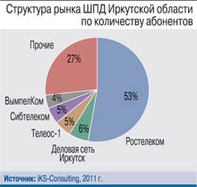На конец 2011 г. в Иркутской области насчитывалось 248 тыс. пользователей высокоскоростного Интернета (28% общего количества домохозяйств). Рынок интернет-доступа в Прибайкалье остается сильно фрагментированным – на долю игроков локального масштаба приходится 27% высокоскоростных подключений региона. Топовые позиции после «Ростелекома», занимающего 53% прибайкальского рынка ШПД, также принадлежат местным провайдерам – оператору «Деловая сеть Иркутск», предоставляющему услуги интернет-доступа в Иркутске, Байкальске, Слюдянке, Шелехове, Усолье-Сибирском, Черемхово, Тулуне; оператору ШПД и КТВ «Теле-ос-1», работающему в Братске, и упоминавшемуся выше «Сибтелекому».