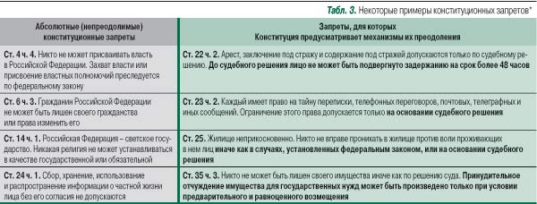 При этом существенно, что если возможность и условия ограничения конституционных прав и свобод федеральными законами предусматриваются процитированной выше ст. 55 ч. 3 Основного закона, то подобной универсальной нормы для снятия своих же запретов Конституция не содержит, а возможность их преодоления (если таковая предусмотрена) явно оговаривается в каждом отдельном случае (табл. 3).