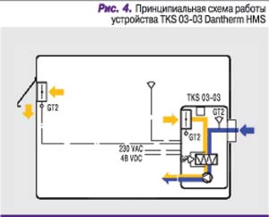 Схема работы фрикулинга раздельного типа с вентиляционным блоком внутреннего размещения (рис. 4) более приспособлена к российским реалиям. Вентиляционный блок оснащается клапаном наружного воздуха с электроприводом, вентилятором (48 В) с плавным изменением скорости вращения и блоком управления; последний не только управляет работой всего устройства, но и подает команды на клапан с электроприводом, через который выходит теплый воздух.