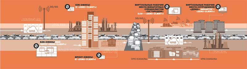 Поскольку для повышения эффективности организации труда необходимо обеспечить возможность сквозного изменения производственных процессов, виртуализация должна охватывать не только контур ЦОДа, но и рабочие места, с тем чтобы создать полностью виртуализованную, максимально гибкую ИКТ-инфраструктуру предприятия.