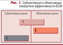 Для оценки эффективности ECM-решений мы анализируем три показателя: экономию времени (Т), сокращение затрат ($), повышение качества (Q) (рис. 1). Экономия времени сотрудников обусловлена автоматизацией деятельности, связанной с поиском и обработкой контента (например, согласованием и утверждением документов), с контролем исполнительской дисциплины (исполнения поручений). Сокращение затрат обеспечивается уменьшением расходов на приобретение, транспортировку и хранение бумаги и расходных материалов, на приобретение и обслуживание принтеров, факсов и т.п. Качество работы сотрудников повышается за счет автоматизации рутинных операций, углубленного анализа бизнес-задач благодаря доступности информации.