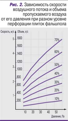 На самом деле перфорированные плитки – эффективный механизм регулировки подачи воздуха. Характеристики плиток с разным уровнем перфорации, рассчитанные по формуле из книги И.Е. Идельчика (И.Е. Идельчик. Справочник по гидравлическим сопротивлениям. 3-е изд. М.: «Машиностроение», 1992), приведены на рис. 2.