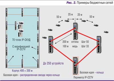 Впрочем, в некоторых прикладных системах, например в таких, где трафик генерируется ситуационно (видеодетектор движения, видео по запросу, системы видеоверификации для СКУД), возможно построение достаточно эффективных и бюджетных сетей на основе простейших коммутаторов (два примера практических инсталляций приведены на рис. 2).