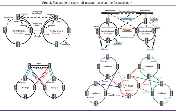 Из нескольких достаточно сложных топологий отказоустойчивых прикладных систем передачи цифровой пакетной информации, представленных на рис. 4, технология быстрого восстановления соединения реализуется только в пределах кольцевых структур. Дополнительные резервные маршруты настраиваются с помощью протоколов STP/RSTP. По этим причинам при проектировании рекомендуется учитывать возможные задержки при восстановлении сети.