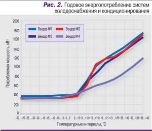 Дальше возник вопрос: какое именно оборудование применить на данном объекте. Мы выбрали для рассмотрения оборудование четырех европейских вендоров, хорошо известных в России. Три из них представили чиллеры с привычными винтовыми компрессорами, а один – с центробежными компрессорами на магнитных подшипниках. Первоначально мы оценили годовое энергопотребление систем холодоснабжения и кондиционирования с учетом мощностей, потребляемых циркуляционными насосами (рис. 2).