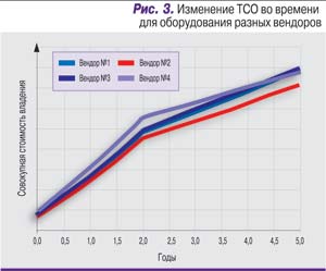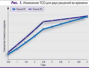 Казалось бы, такое преимущество должно определить наш выбор, но для более объективной оценки потребовалось сделать расчет совокупной стоимости владения. В расчетах мы максимально использовали доступную информацию о стоимости систем, а также то обстоятельство, что ЦОД будет вводиться в эксплуатацию в пять этапов. Таким образом, просчитав ТСО этих двух систем, мы получили графики, показанные на рис. 1.