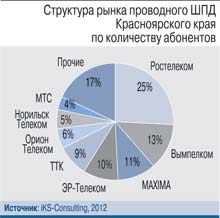 Региональный рынок проводного интернет-доступа, несмотря на процессы консолидации, остается фрагментированным. Об этом говорит тот факт, что на долю «Ростелекома», самого крупного игрока в данном сегменте, приходится чуть более четверти общего количества интернет-подключений физлиц, а доля «ВымпелКома» (второе место по размеру абонентской базы ШПД) не превышает 13%. «ЭР-Телеком», пришедший на рынок Красноярска весной 2010 г., за два с половиной года работы сумел занять 9% регионального рынка.