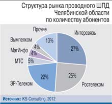У региональных провайдеров ШПД совокупный объем доходов в 2012 г. увеличился на 14%. Уровень конкуренции в сегменте проводного интернет-доступа достаточно высок – из федеральных операторов на местном рынке, кроме традиционного «Ростелекома», развивают сети ШПД «ЭР-Телеком», «ВымпелКом», МТС и ТТК. «ЭР-Телеком» начал работать в Челябинске в 2006 г. и довольно быстро завоевал значимую долю челябинского рынка. С 2011 г. компания также представлена в Магнитогорске. МТС предлагает услуги скоростного интернет-доступа в Челябинске с 2011 г. на базе приобретенного оператора «Мультинекс». Проводной интернет от «Билайна» появился в Челябинске в начале 2012 г. Активно строит сети в Челябинской области и ТТК, сегодня оператор присутствует в Челябинске, Кыштыме и Златоусте.