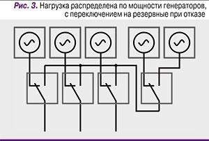 По мнению автора, для больших ЦОДов наиболее правильный вариант, в силу его примитивности, – это «нарезка» нагрузки по мощности единичных генераторов и подхват ее резервными при отказе основного, как показано на рис. 3. В этой схеме изначально запускаются все генераторы. Если все основные (на рисунке слева) успешно запустились, то резерв (на рисунке справа) останавливается. Если же один из основных генераторов не запустился, то его дальнейший запуск блокируется, а его АВР берет питание от дизеля с резервной линии.