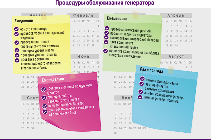 Обслуживание генератора предполагает, что проверки основных систем проводятся ежедневно; дополнительно к этому рекомендуется выполнять определенные операции еженедельно, ежемесячно и каждые полгода (подробно они перечислены во врезке «Процедуры обслуживания генератора»).