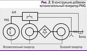 В наиболее продвинутом варианте (рис. 2) в схему, на тот же вал, добавляется еще один вспомогательный генератор на постоянных магнитах (PMG). Его назначение – непосредственное питание регулятора по цепи, развязанной с основным питанием. Разумеется, старт генератора при этом гарантирован.