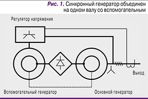 Наиболее распространенный на сегодня дизайн – объединение на одном валу синхронного генератора с вспомогательным генератором, обеспечивающим для него ток ротора (рис. 1). Для выпрямления тока возбуждения для ротора основного генератора служат диоды, смонтированные на нем же.
