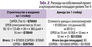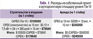 Определим стоимость в расчете на 1 стойку за 10 лет эксплуатации. При коэффициенте энергоэффективности PUE, равном 1,5, общее энергопотребление стойки (оборудование на стойке + питание жизнеобеспечивающей инфраструктуры) составит 7,5 кВт. Расчет платы за электроэнергию на стойку в течение 10 лет дает 3,60 руб./кВтч = $0,12 (при курсе 30 руб. за $1). Сопоставляем затраты (табл. 1).
