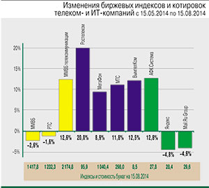 С 15 мая по 15 августа индекс ММВБ вырос на 2,6% (до 1417,8 п.). Индекс РТС потерял 1,6% и составил 1232 п. Отраслевой индекс «ММВБ телекоммуникации» значительно обогнал широкий рынок и вырос на 12,6%.