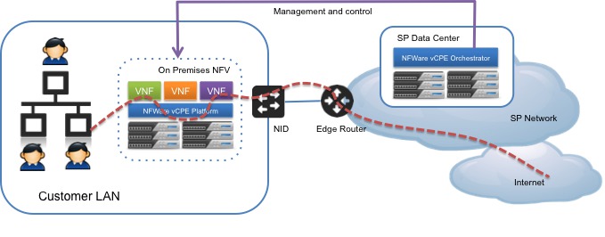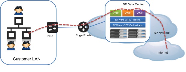 Сегодня для того, чтобы воспользоваться этими услугами, нужно установить и настроить соответствующее оборудование на стороне клиента. Однако NFV и SDN помогает решить эту задачу за счет виртуализации сетевых функций в программных приложениях, которые можно запустить как на обычных серверах, так и на виртуальных машинах, работающих на этих серверах. Оператор может, используя лишь одно сетевое интерфейсное устройство для разграничения трафика, позволить всем остальным функциям располагаться на своей территории, а SDN использовать для упрощения и управления этой сетью для клиента.