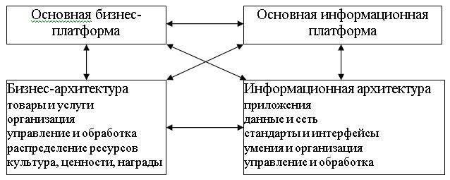 Согласно концепции, основная бизнес-платформа рассматривается как набор стратегий, рынков, регламентов, технологий производства и ресурсов, выбранных предприятием.Бизнес-архитектура – это набор товаров и услуг, организационных структур, процессов управления, распределения ресурсов, ценностей и стимулов, необходимый для внедрения основной бизнес-платформы. Основная ИТ-платформа представлена совокупностью компьютерных технологий, которые могут быть доступны предприятию, и способов работы с этими технологиями внутри организации. В свою очередь, ИТ-архитектура – это набор определенных архитектур и продуктов, выбранный для реализации и поддержки работы основной ИТ-платформы.