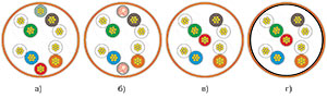 | а) с двумя дополнительными медными проводниками; б) с двумя дополнительными полимерными световодами; в) с одним медными проводником; г) с дополнительным медным проводником и оплеточным экраном |