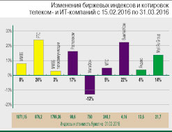 Индикатор «широкого рынка» ММВБ к концу марта достиг значения в 1871 пункт, близко подобравшись к историческим максимумам далекого 2007-го – в 1970 пунктов. Его долларовый аналог, индекс РТС, за полтора месяца вырос на 24% благодаря существенному укреплению рубля по отношению к основным валютам (в частности, доллар потерял в цене 13%, снизившись до 67,2 руб., евро просел на 11%, до 76,5 руб.). Почти все торгующиеся на иностранных площадках акции и расписки российских телеком- и ИТ-компаний также показали устойчивую положительную динамику котировок.